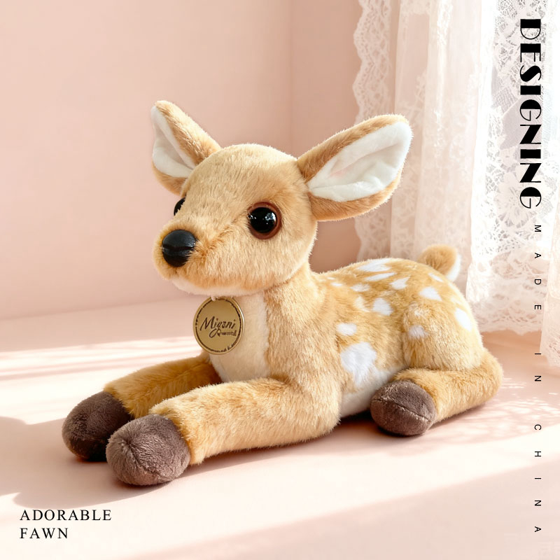 The image shows a cute plush toy fawn (baby deer) lying down on a peach-colored surface. The stuffed animal has light brown fur with white spots on its back, dark brown hooves, and large black eyes that give it an adorable expression. It wears a round gold tag on its neck with the word “Miyoni” written on it, indicating it’s from the Miyoni by Aurora plush collection.
