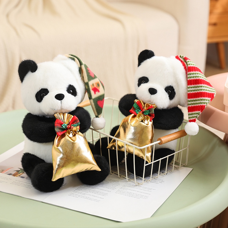 A cute panda plush toy wearing a festive striped Santa hat and holding a shiny golden gift bag.