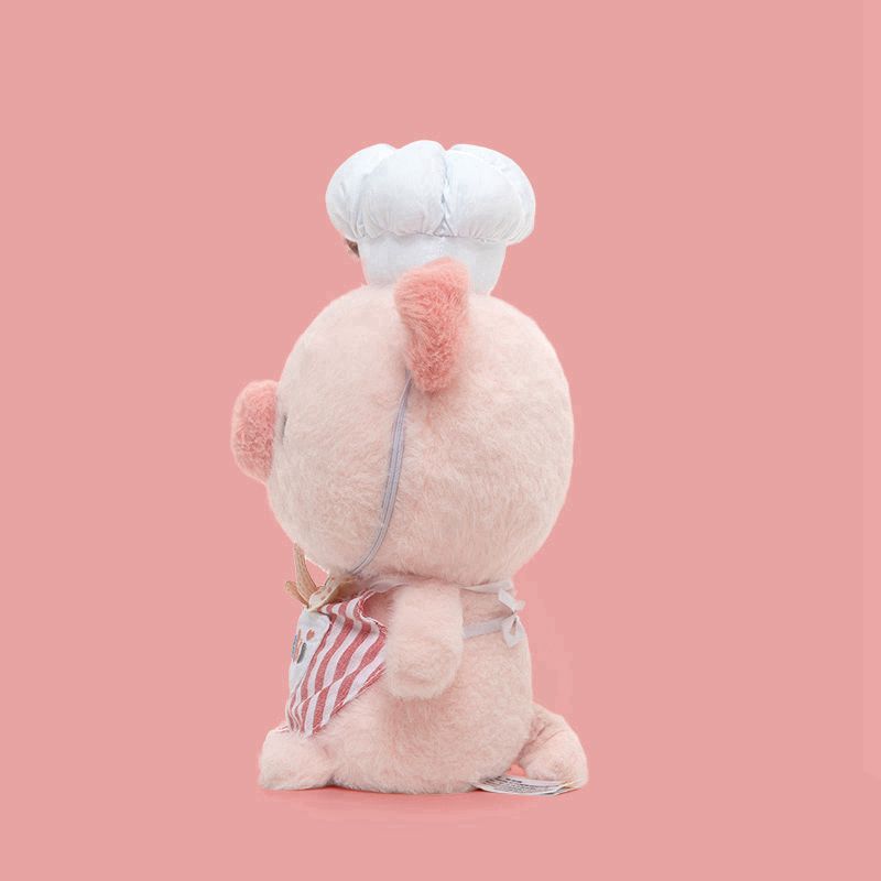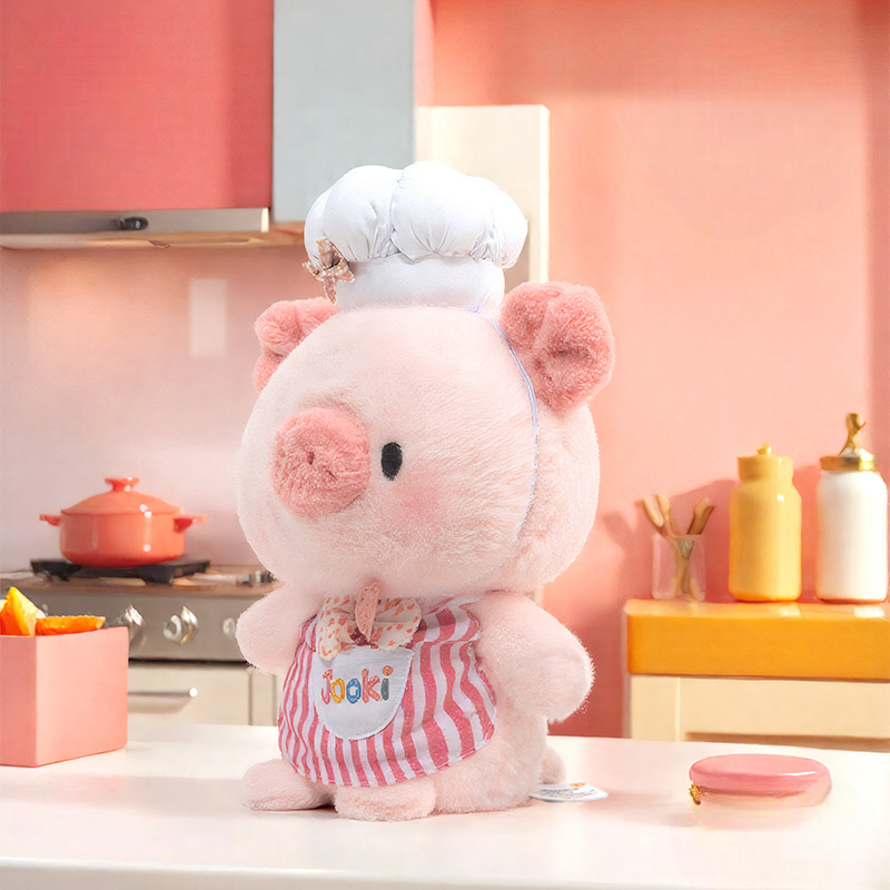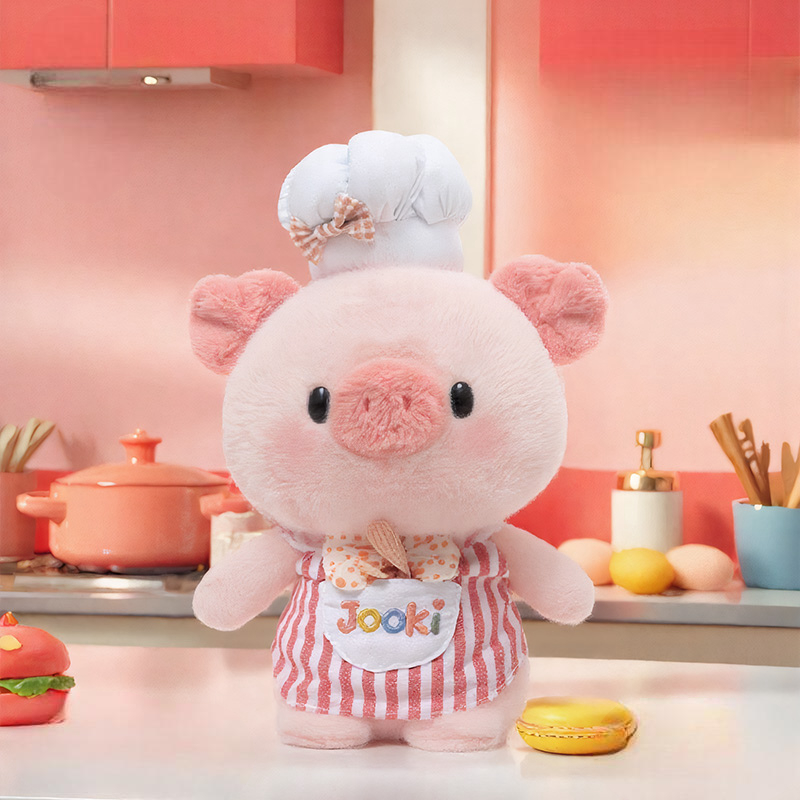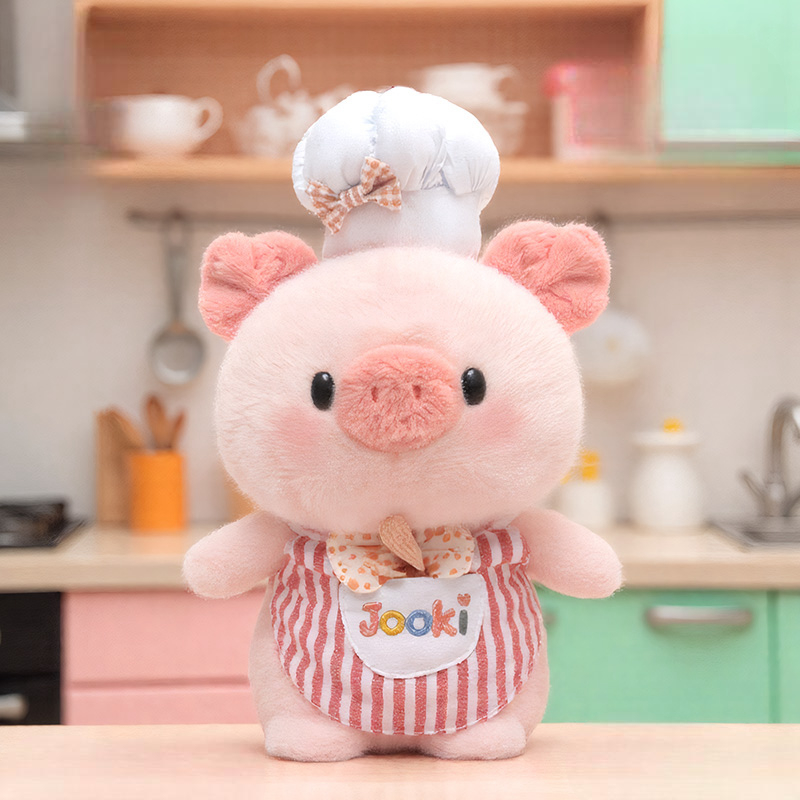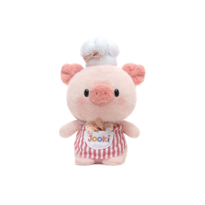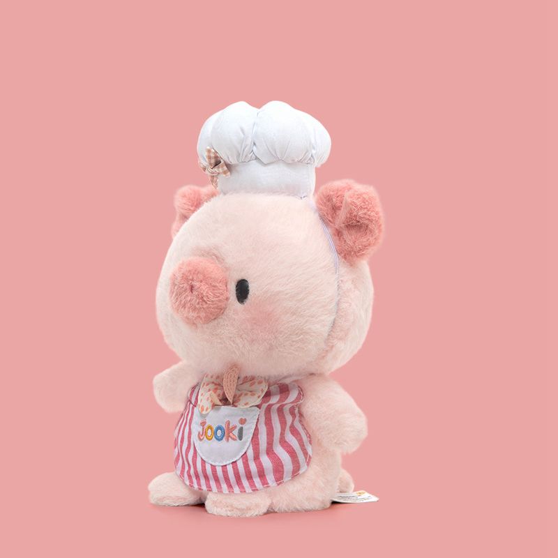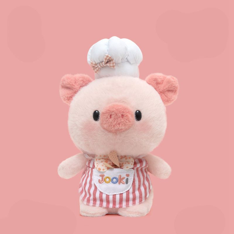 A charming pink pig plush dressed in a cute chef-themed outfit, displayed against a clean white background. The plush features soft blush pink fur, round black eyes, and a darker pink snout. It wears a light blue chef hat with a small beige checkered bow, along with a pink-and-white striped apron embroidered with “Jooki” on the front. A small beige scarf is tied around its neck, enhancing the bakery or kitchen theme. The overall design is playful, sweet, and ideal for gift shops, themed décor, or collectible plush series.