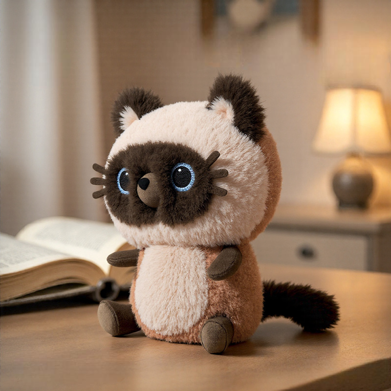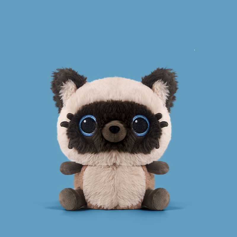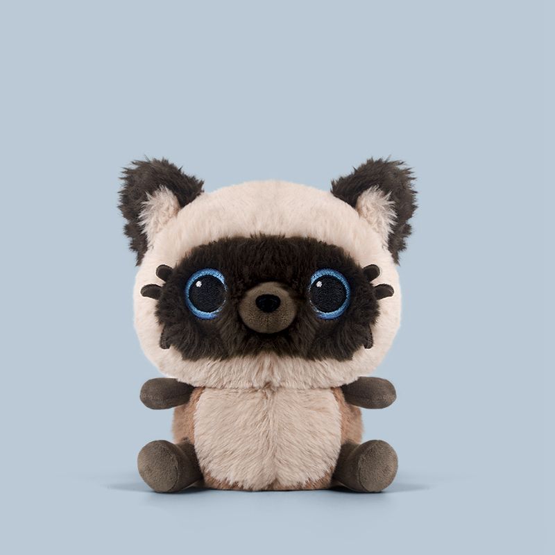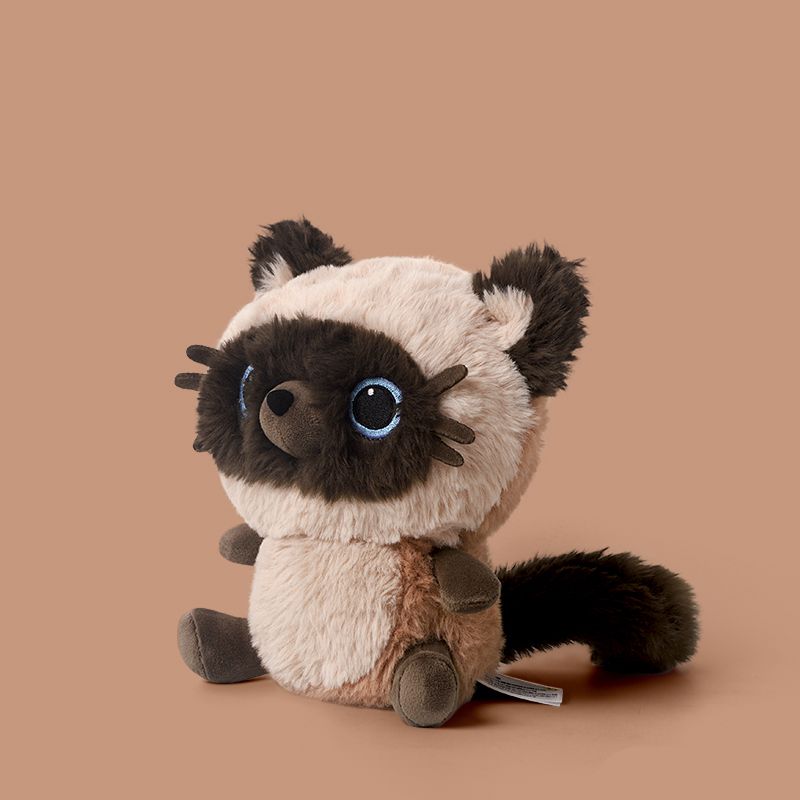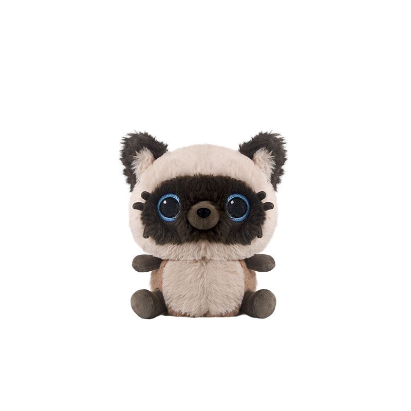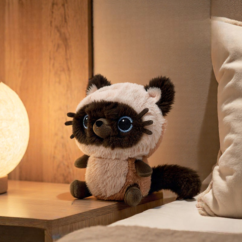 It features a fluffy cream-colored body with dark brown and black accents on the face, ears, and limbs. The toy has large round blue eyes that give it a cute and friendly expression. Its small rounded ears, soft fur texture, and sitting pose make it look cuddly and perfect as a decorative plush or a children's stuffed toy.