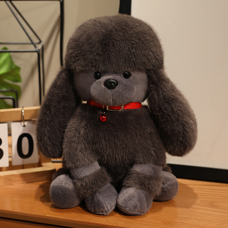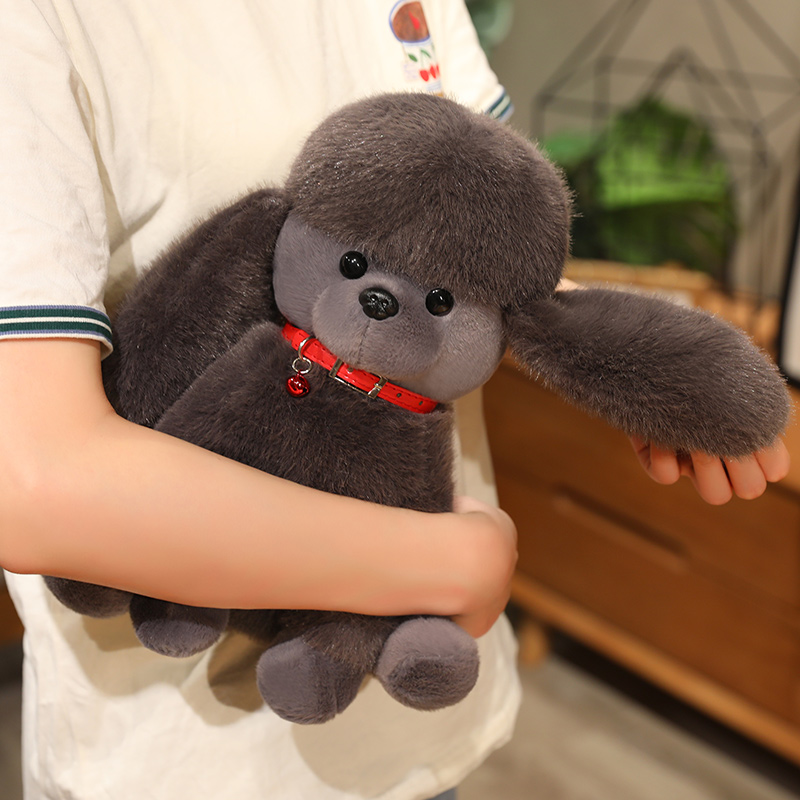A soft white puppy plush toy sits upright against a clean white background. It features fluffy fur, long floppy ears, round black eyes, and a small black nose that give it a sweet and gentle expression. Around its neck is a bright red collar with a small decorative bell, adding a charming and playful touch. The simple white backdrop highlights the plush’s soft texture and makes it ideal for product display.