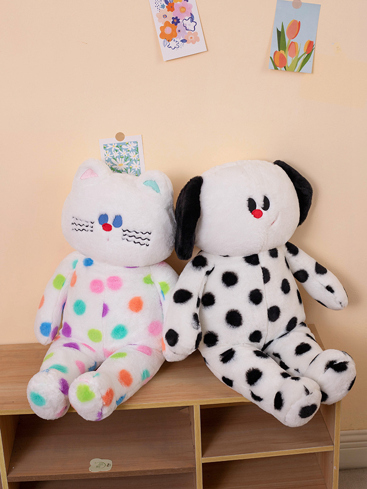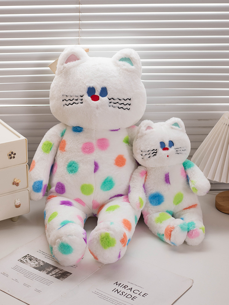 A large white cat plush toy sits upright in a cozy indoor setting. It features soft, fluffy fur decorated with bright multicolored polka dots in pink, green, blue, orange, and purple. The cat has embroidered facial details, including blue eyes, a red nose, and black whiskers, giving it a playful and cheerful expression. The background includes a small drawer unit and a table lamp, creating a warm, homey atmosphere that highlights the plush’s vibrant and fun design.